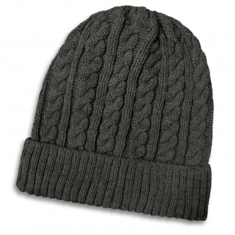 Stylish acrylic beanie which features a chunky cable knit pattern and a roll up cuff. It is available in one size which will fit most people.
